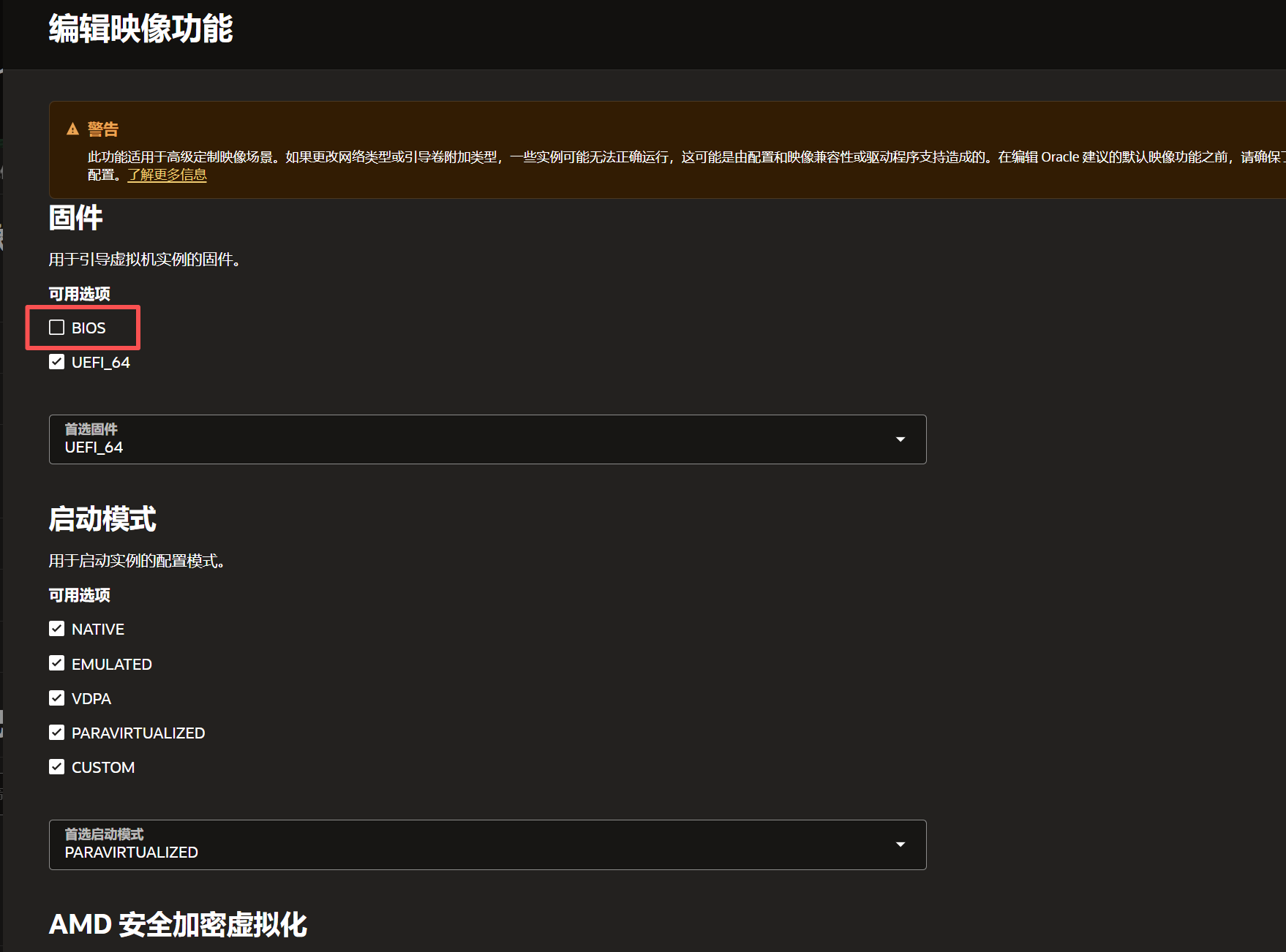 在ARM实例上安装后可能会出现无法使用的问题,这主要是因为ARM架构对启动方式(必须是 UEFI)和硬件驱动(virtio)有严格要求,默认导入的固件选项是BIOS,所以需要在【编辑映像功能】里面,将固件的BIOS选项取消勾选,仅保留UEFI_64即可,如下图: